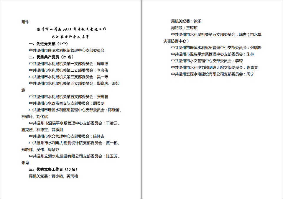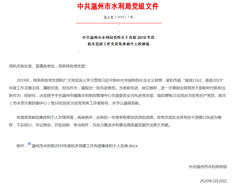 近日,從溫州市水利局黨組傳來喜訊,我公司黨總支三名黨員周寧、陳玉芳、朱肖榮獲2019年度水利局機(jī)關(guān)黨建工作先進(jìn)個(gè)人稱號(hào)。根據(jù)中共溫州市水利局黨組發(fā)布的《中共溫州市水利局黨組關(guān)于表彰2019年度機(jī)關(guān)黨建工作先進(jìn)集體和個(gè)人的通報(bào)》(溫水黨﹝2020﹞7號(hào)),周寧獲優(yōu)秀黨務(wù)工作者稱號(hào),陳玉芳、朱肖獲優(yōu)秀共產(chǎn)黨員稱號(hào)。