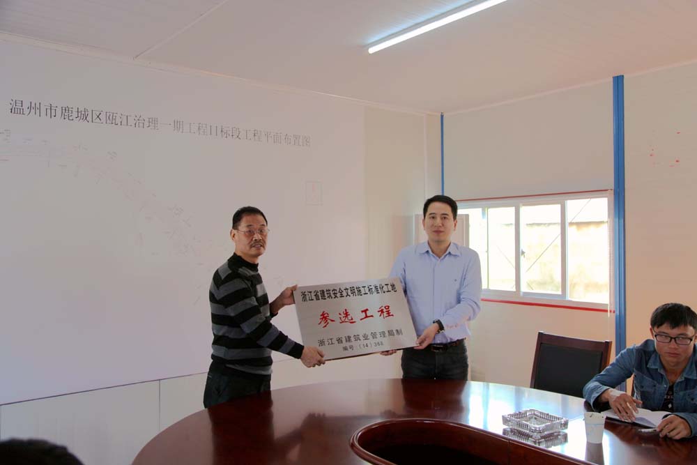 由我公司承建的溫州市鹿城區(qū)甌江治理一期工程ⅱ標段獲省級安全文明施工標準化工地參選工程,2014年11月22日,公司總經(jīng)理林勇軍帶隊前往項目部授牌。