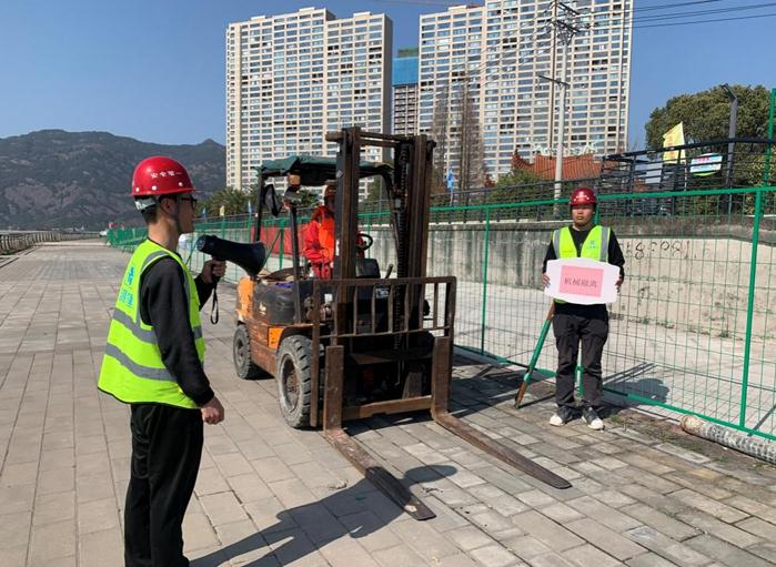 科目二機(jī)械撤離,模擬甌江潮水有漫過(guò)現(xiàn)場(chǎng)平臺(tái)的風(fēng)險(xiǎn),撤離組指揮現(xiàn)場(chǎng)叉車機(jī)械撤離到安全區(qū)域。