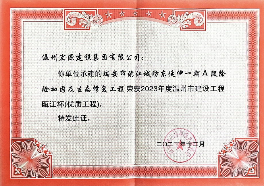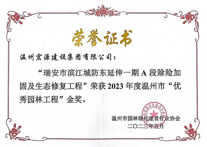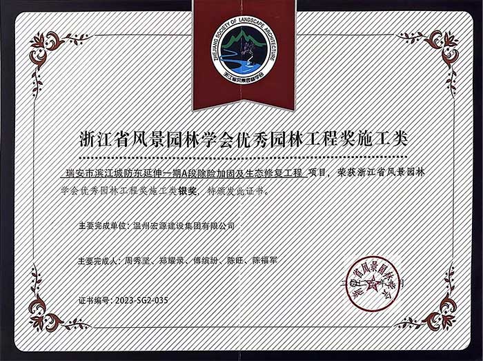 近日從浙江省住建廳、浙江省風(fēng)景園林學(xué)會、溫州市園林綠化行業(yè)協(xié)會、溫州市住房和城鄉(xiāng)建設(shè)局獲悉,我公司中標承建的瑞安市濱江城防東延伸一期A段除險加固及生態(tài)修復(fù)工程在2023年分別被評為“2023年度浙江省建筑施工安全生產(chǎn)標準化管理優(yōu)良工地”、“2023年度浙江省風(fēng)景園林學(xué)會優(yōu)秀園林工程獎施工類銀獎”、“2023年度溫州市’優(yōu)秀園林工程’金獎”和“2023年度第一批溫州市建設(shè)工程“甌江杯”(優(yōu)質(zhì)工程)”。