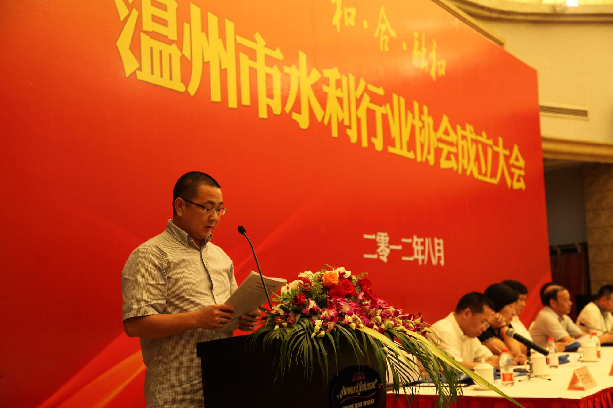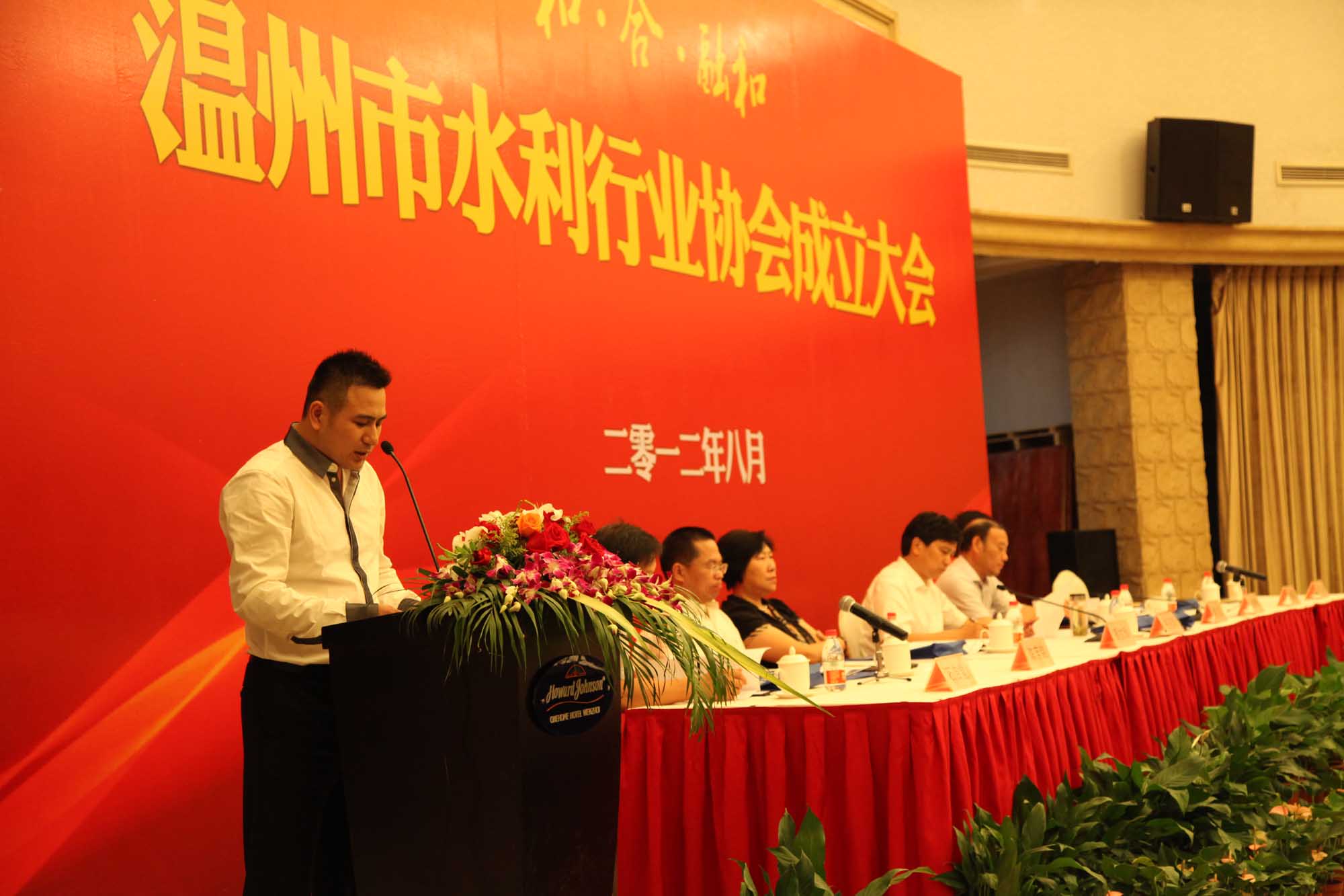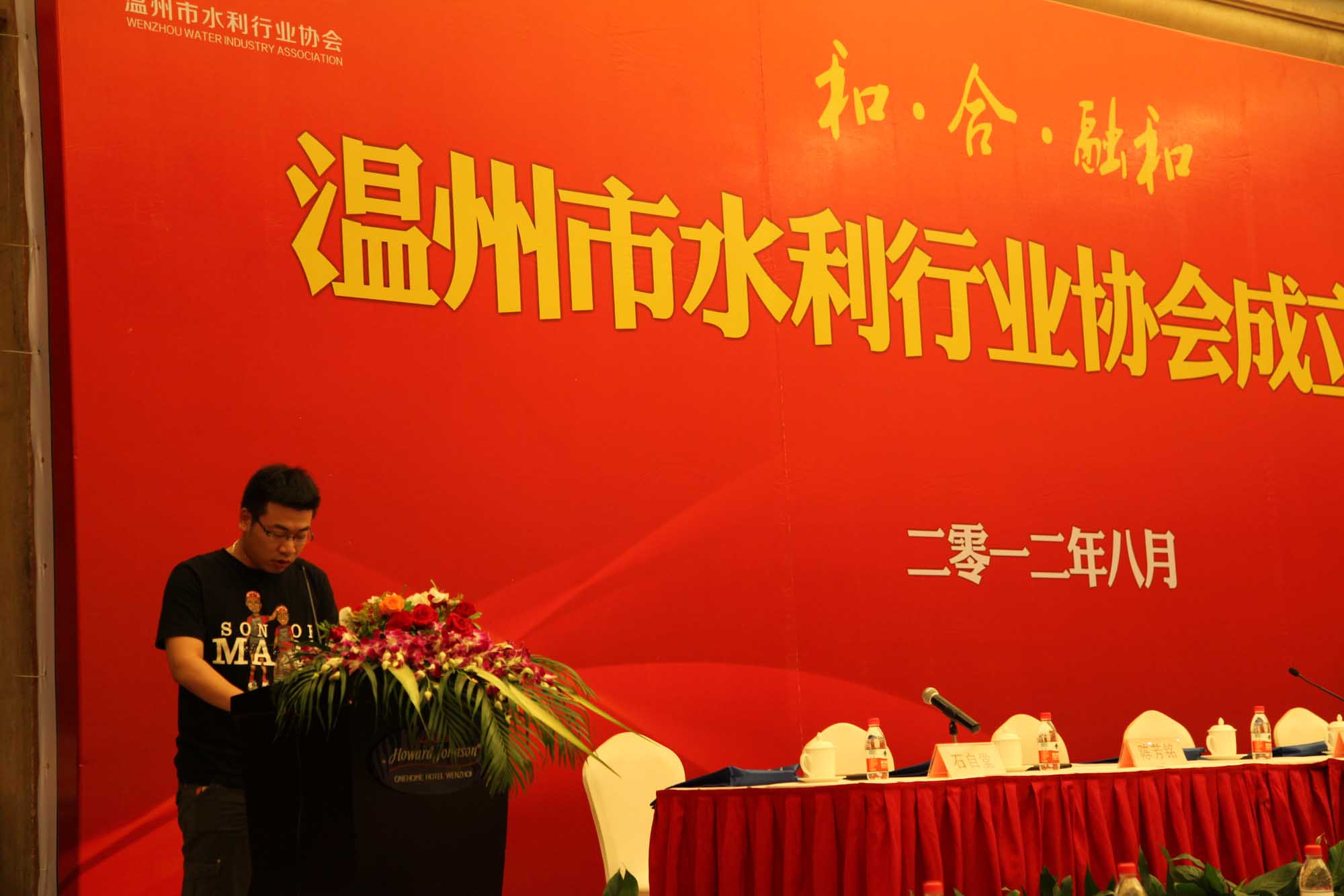 8月8日下午3點,溫州市水利行業(yè)協(xié)會成立大會暨一屆一次會員大會在溫州萬和豪生大灑店隆重召開。副市長任玉明、溫州市政協(xié)副主席黃兆鴿、溫州市人大農(nóng)資委主任周文珍、市委統(tǒng)戰(zhàn)部副部長、市工商聯(lián)黨組書記陳芳銘、市水利局黨組書記、局長林孝悌、武漢大學(xué)教授石自堂等參加了會議,同時,市工商聯(lián)相關(guān)部門及相關(guān)協(xié)會,市民政局相關(guān)部門,市水利局領(lǐng)導(dǎo),各區(qū)、縣水利局領(lǐng)導(dǎo)參加了此次會議。我公司當(dāng)選協(xié)會會長單位。大會由溫州電臺著名主持人江帆主持。