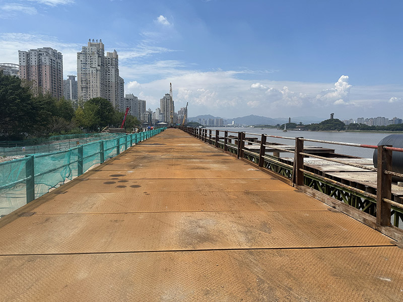 鋼便橋全長610m,采用鋼結(jié)構(gòu)形式。其主要功能是為提供施工期間的材料運輸、設備進出及人員往來的關鍵通道,是保障整個項目施工進度的“生命線”。