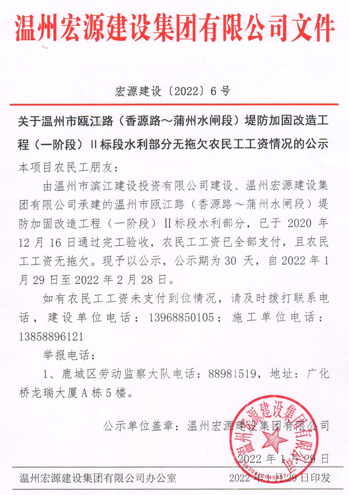 關(guān)于溫州市甌江路(香源路~蒲州水閘段)堤防加固改造工程(一階段)Ⅱ標段水利部分無拖欠農(nóng)民工工資情況的公示