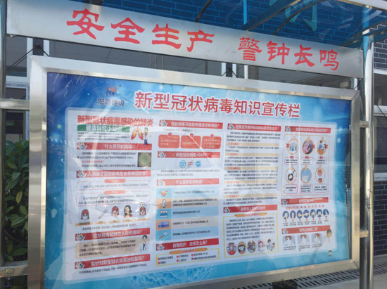 做好疫情防控的關(guān)鍵在于提高項(xiàng)目部人員自我保護(hù)意識(shí)。復(fù)工前項(xiàng)目部多次召開視頻會(huì)議,將疫情防控作為重點(diǎn)來(lái)抓,在精神層面首先建立起一道堅(jiān)固的防護(hù)網(wǎng)。2月18日,第一批項(xiàng)目部管理人員返崗后,根據(jù)項(xiàng)目部防疫工作安排,一方面在項(xiàng)目部出入口、宣傳欄等多處制作、張貼防護(hù)宣傳標(biāo)語(yǔ),宣傳和普及疫情防控知識(shí);另一方面,多方聯(lián)系廣告公司制作了第一批疫情防控宣傳冊(cè),分發(fā)給項(xiàng)目部每一員。