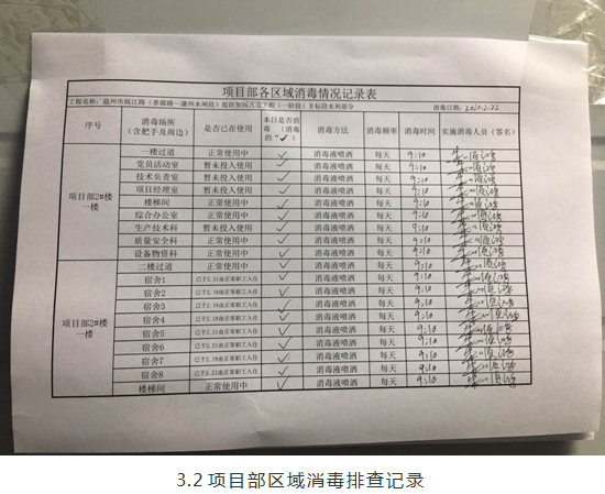 2月18日項(xiàng)目部人員返崗后進(jìn)行了第一次項(xiàng)目部全面消殺的防疫措施工作,之后項(xiàng)目部每天將安排專人在工程復(fù)工前對(duì)工程施工現(xiàn)場(chǎng)、辦公生活區(qū)域及其他人員活動(dòng)場(chǎng)所(工地食堂、宿舍以及廁所等場(chǎng)所)進(jìn)行預(yù)消毒處理并設(shè)置廢棄防疫用品密閉式垃圾箱,并做好標(biāo)識(shí),嚴(yán)格按照衛(wèi)生防疫要求處置廢棄口罩等醫(yī)用防護(hù)用品垃圾。正式開工后項(xiàng)目落實(shí)每日消毒制度,對(duì)上述場(chǎng)所開展每日不少于兩次的通風(fēng)、消毒和防疫工作,并做好記錄。